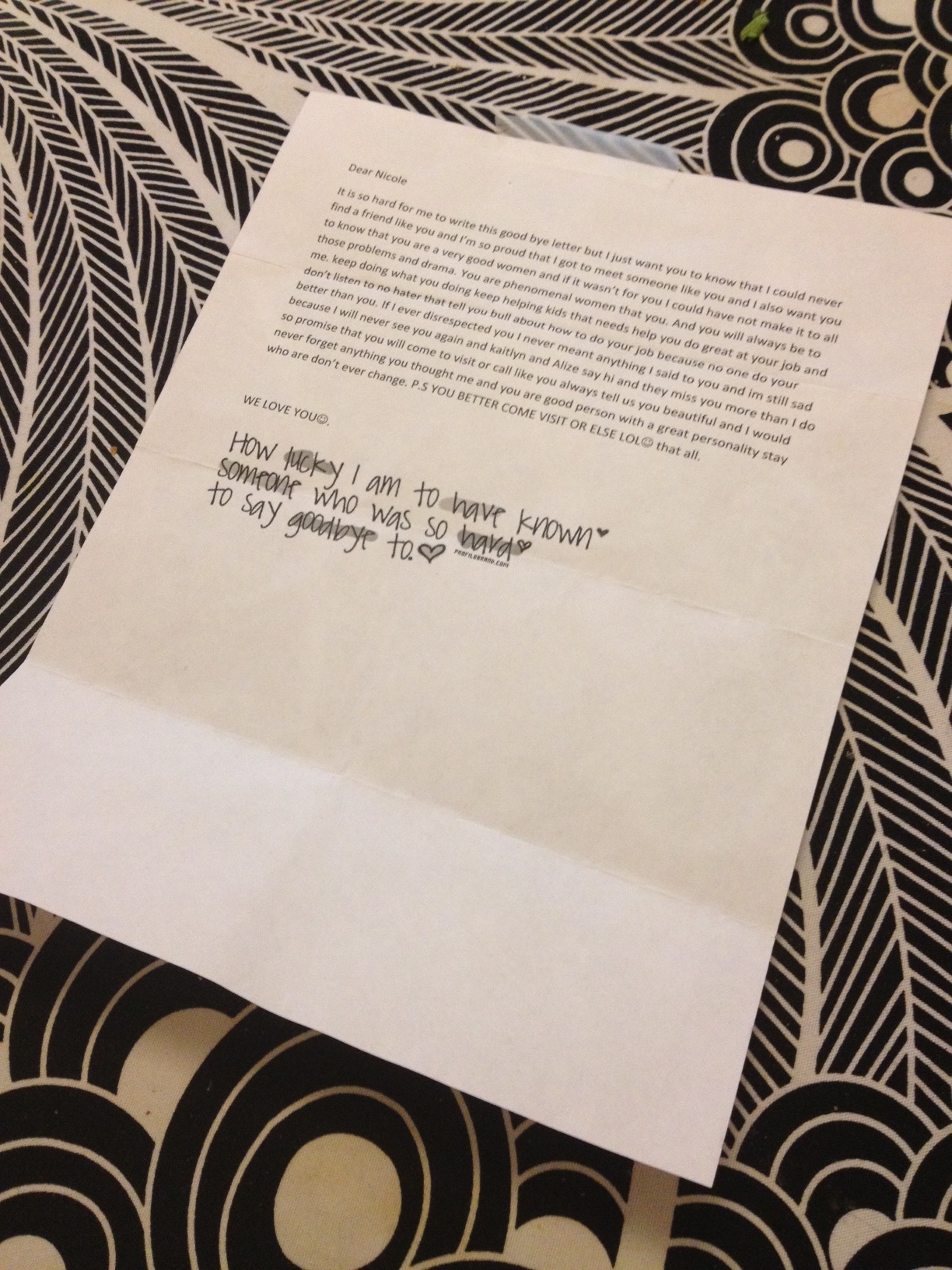 It is so hard for me to write this goodbye letter but I just want you to know that I could never find a friend like you and I’m so proud that I got to meet someone like you and I also want you to know that you are a very good woman and if it wasn’t for you I could not have made it through all those problems and drama. You are a phenomenal women… and you will always be to me. Keep doing what you doing keep helping kids that need help. You do great at your job and don’t listen to no hater that tell you bull about how to do your job because no one do your job better than you. If I ever disrespected you I never meant anything I said to you and I’m still sad because I will never see you again and Catherine and Emily* say hi and they miss you more than I do so promise that you will come to visit or call like you always tell us. You beautiful and I would never forget anything you taught me and you are a good person with a great personality stay who you are don’t ever change.